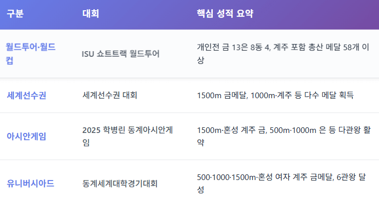 여기에 2024-25, 2025-26 시즌 월드투어에서도 1500m·1000m 랭킹 상위권을 꾸준히 유지하며, 항상 포디움 후보로 언급되고 있습니다.